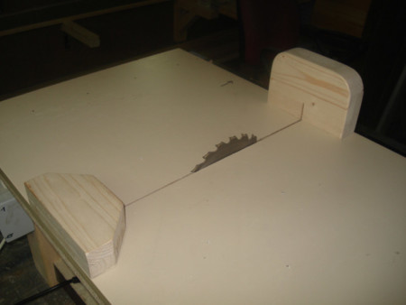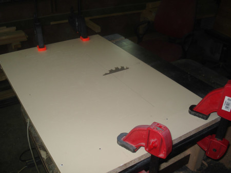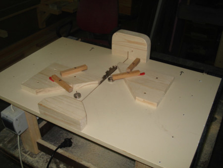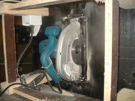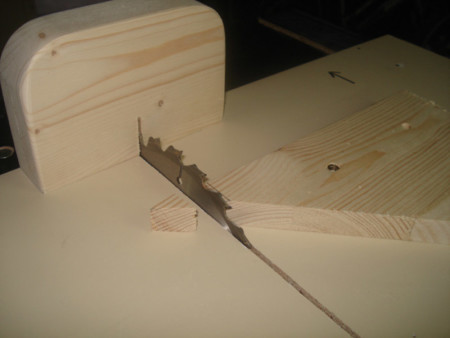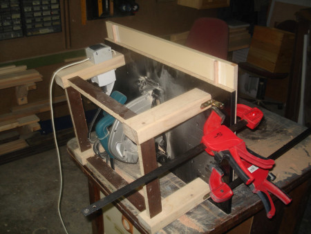 Slika 9: Kada je ploča postala pokretna, stegama sam je još jednom fiksirao za postolje cirkulara i isto okrenuo na stranu. Onda sam upalio cirkular i gurnuo ga kroz ploču. Tako sam dobio tzv nulti rez.