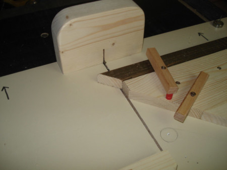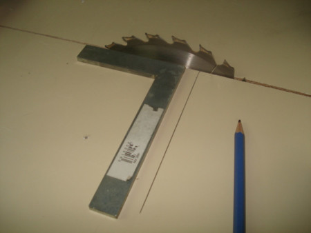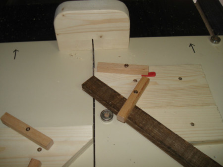 Slika 16: Onda sam uz pomoć ove linje i tri šarafa pričvrstio firung tako da mu ćošak viri preko kanala gdje prolazi list cirkulara i na njemu takođe izrezao „nulti“ rez.