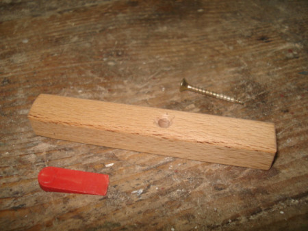 Slika 22: Toggle clamp na domaći način: Bukova letvica (ostala od „šina“) sa rupom nešto većeg prečnika od šarafa (ovo je važno), šaraf i mali keramičarski klin od plastike.