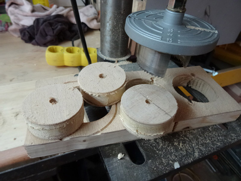 | Slika 2: Na stonu bušilicu montirao sam one testere za krugove i započeo im konture po površini. Prije konačnog rezanja pripremio sam i ove rupe(ice) sa strana kao otvore da izlazi piljevina. O tome sam i ranije pisao – tako se smanjuje trenje (zagrijavanje, dim) a brže se i izreže.