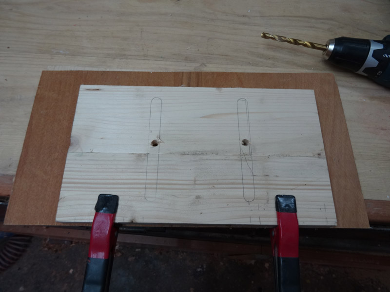 | Slika 5: Dok je ljepilo hvatalo pozabavio sam se izradom postolja. Nešto na principu onoga za stonu bušilicu. Prvo sam najvećom testerom u komadu šperploče otvorio rupu kao na slici.