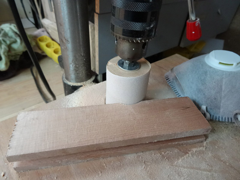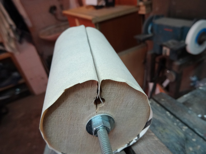| Slika 16: I finale – tj još da se montira sam šmirgl papir. Izbušena rupa skroz kroz disk u koju ću umetnuti tipl što drži papir. “Tipl šipke” se, takođe, kupuju u gvožđari ili ih jednostavno napravite sami. Visina borera kojim ćete bušiti ovu rupu Vam, u stvari, diktira i visinu diskova koje možete praviti.