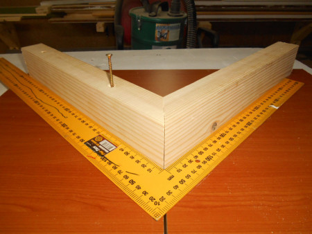 Slika 13 E ovo je, ustvari, najvažniji segment izrade. U desnu letvu sam izbušio dvije pomoćne rupe za pozicioniranje šarafima. Onda sam je pod tačnih 90 stepeni postavio u odnosu na lijevu letvu i ušarafio u tablu odozgo. Znači – jedino je važno da nam ova dva oslonca budu pod tačnih 90 stepeni. Onda sam klizač okrenuo i odozdo utvrdio i desni oslonac sa još šarafa.