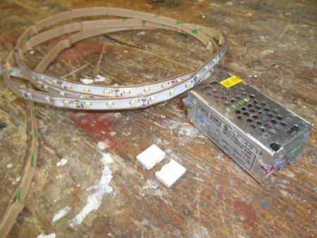 Oprema kupljena u prodavnici rasvjete. Nekih 2m samoljepljive LED trake, spojnice i trafo. Trafo prevodi struju sa mrežne (220V naizmjenična) u jednosmjernu (12V). Pri izboru trafoa trebalo je voditi računa o njegovoj snazi. Jedinica za snagu je Watt. Na 2m trake ispostavilo se da moram uzeti trafo od 10W (čini mi se da su pomenuli kako metar trake zahtjeva 4W snage).