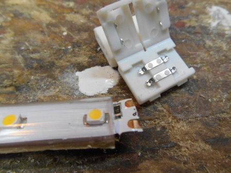 Taj dio trake koji viri se umetne u jedan kraj spojnice. Spojnica funkcioniše kao štipavica tj zamišljena je da se traka samo ubaci i spojnica zatvori. Međutim, pokazalo se da je to prilično klimav spoj i da se prilikom pomjeranja trake svjetlo svaki čas gubilo. Onda sam zalio malo vrele plastike, ponovo zatvorio i bilo je OK. Važno: traka, spojnica i jednosmjerni izlaz iz trafoa svi imaju oznake „+“ i „-„ pa, kada ih slažemo, treba obratiti pažnju da postavimo plus na plus i minus na minus.