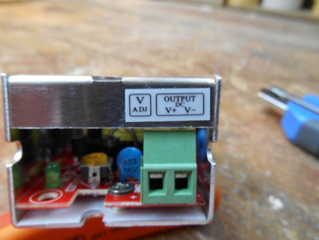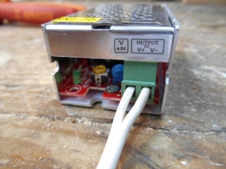 Drugi kraj ovog dvožilnog kabla sa prethodne slike sam umetnuo u jednosmjerni izlaz trafoa (output DC). Na slici se vidi ovo „V+“ i „V-„ tj plus i minus koje treba poravnati sa istim znacima na traci (ako se okrene neće da svijetli ali nije pregorela ili tako nešto).
