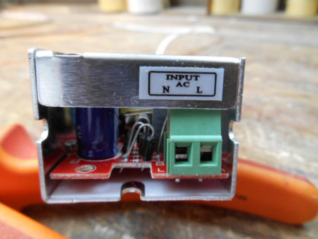 Sa druge strane trafoa (input AC) se umetne kabal sa kućne instalacije. Naravno prilikom montaže struja je isključena na osiguraču a oznake „N“ i „L“ znače nula i linija (faza). Ja sam u radionici koristio neki stari kabal kako bih provjerio da li radi a pri ugradnji (ispod visećih elemenata u kuhinji) zakačio na pravi kabal.