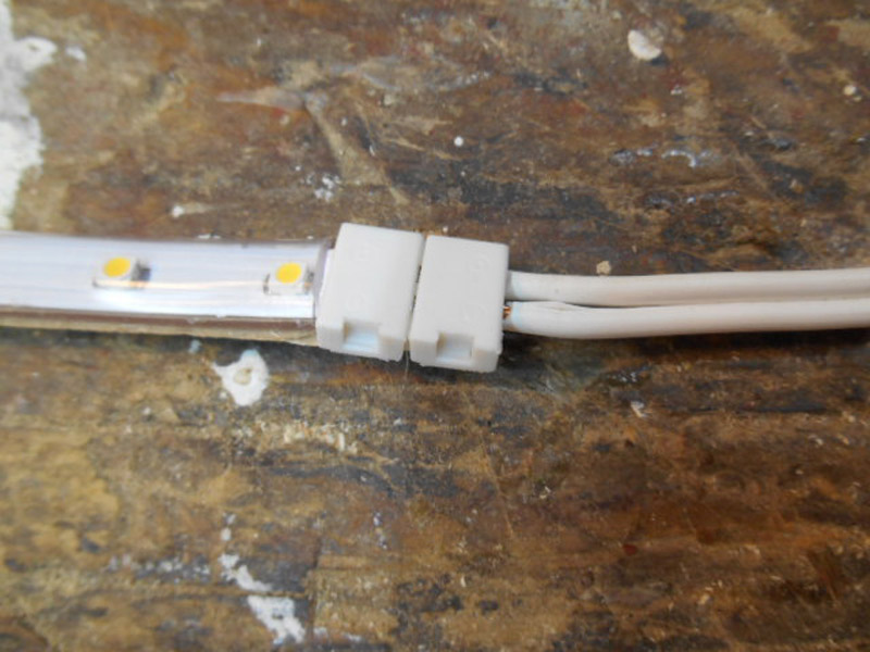 Taj dio trake koji viri se umetne u jedan kraj spojnice. Spojnica funkcioniše kao štipavica tj zamišljena je da se traka samo ubaci i spojnica zatvori. Međutim, pokazalo se da je to prilično klimav spoj i da se prilikom pomjeranja trake svjetlo svaki čas gubilo. Onda sam zalio malo vrele plastike, ponovo zatvorio i bilo je OK. Važno: traka, spojnica i jednosmjerni izlaz iz trafoa svi imaju oznake „+“ i „-„ pa, kada ih slažemo, treba obratiti pažnju da postavimo plus na plus i minus na minus.