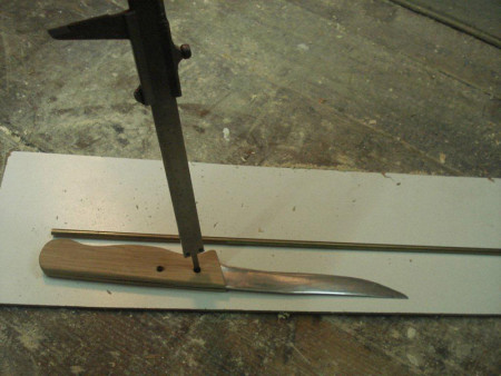 Slika 12: Sada nam treba mjera za rezanje štifta. Šublerom precizno izmjerite dubinu rupe kao na slici. Dodajte jedan milimetar za zakivanje i odrežite bonsekom od šipke.Jedan milimetar duže je bio sasvim dovoljan jer sam konačnu rupu u drvetu bušio na istu mjeru kao i mesing (Ø6) a preveliko zakivanje (npr 2 mm) bi definitivno dovelo do pucanja drveta.PS. Da je šipka bila tanja, npr Ø4, onda bih ostavio 2 mm.