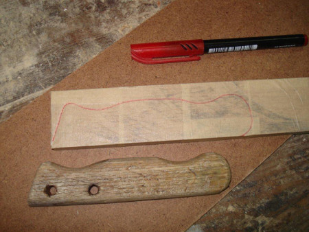 Slika 3: Letvice ulijepite molerskom trakom. Potpuno ih obmotajte. Sačuvanu polovinu stare ručke iskoristite kao šablon i opišite konturu po kojoj ćemo rezati nove drške.
