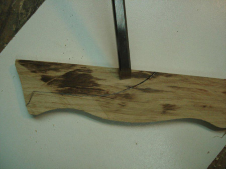 Slika 8: Prčvrstimo u stegu i lagano skinemo tanak sloj drveta (Idealno ½ debljine metalnog dijela). Lakše je koristiti tanko dlijeto jer jednostavno bolje „klizi“ kroz drvo. Ako ima određenih neravnina možete ih i šmirglom malo dotjerati.