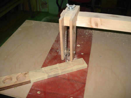 Slika 4: Sada već počinjemo sa teškom artiljerijom. Utvari to je naopako okrenuta ubodna testera a cijela konstrukcija koja je podržava je napravljena po uzoru na jednu iz ShopNotes magazina.Pošto se radi o unikatnoj skalameriji – ovaj dio rezanja moram prepustiti vašoj sopstvenoj artiljeriji i dovitljivosti. Dakle, svako za sebe do sledećeg koraka.