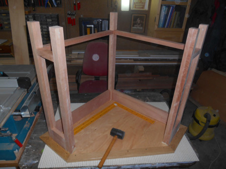 | Slika 29 Lijepljenje noseće konstrukcije išlo je u tri faze. Prvo sam ulijepio bokove. Gornje povezujuće letve (gornji vijenac) i noge sam keksovao a donje (donji vijenac) u prvom koraku samo ulijepio a kasnije ukucavao drveni tipl (8 mm) bušeći skroz kroz nogu pa u letvu koliko god borer doseže.