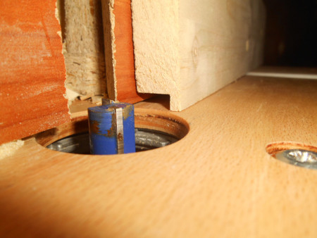 | Slika 57 Špicevi umetnuti u rupe na frontu, odozo postavljene M8 šajbe da naprave malo zazora i na špiceve nataknuta hrastova letva koja će biti čelo fioke. U rupice od špiceva ostalo je još da se ubuše rupe 8 mm za tiple.