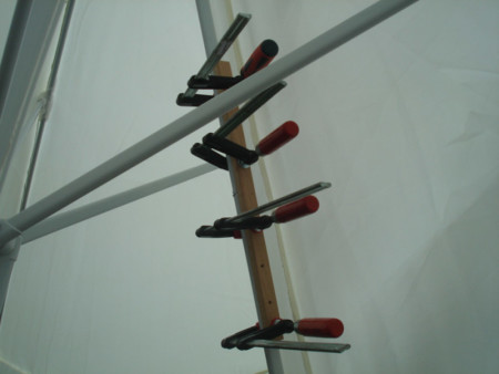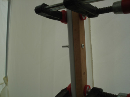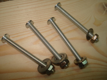 Pošto sam imao samo 4 šarafa valjanog prečnika i dužine za montažu prečke sam upotrijebio običan ekser. Kraj sa špicem sam prvo blago zakrivio (da ne ispada) i onda ga armiračkim kliještima otkinuo na mjeru.