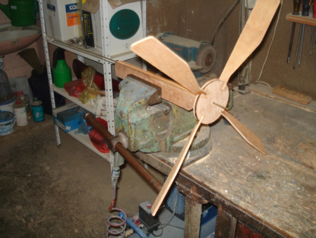 Slika 45: Za nosač vetrenjače sam iskoristio komad neke stare garnišle (drška od metle je takođe idealna) i u njega ukucao „obezglavljeni“ ekser. Kod ovog eksera takođe nije upalilo iz prve jer sam u originalu stavio tanji ekser i još ga podmazao. Rezultat je bio da se vetrenjača previše lako okretela oko svoje ose tj lakše nego što se sam propeler okretao. Onda sam stavio deblji ekser, nisam podmazivao i proradilo je kako treba tj propeler je postalo mnogo lakše okrenuti nego samu vetrenjaču oko eksera.